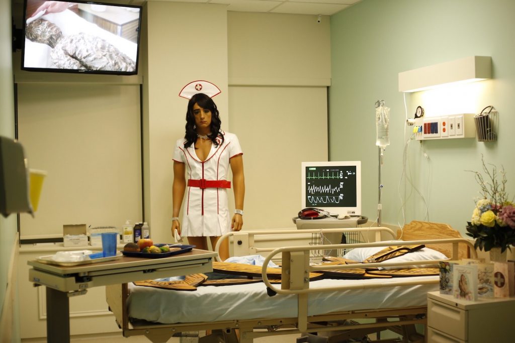 The Biennial creates an experiential environment of calculated tensions and unique reactions to the narratives and categories that seek to define our daily lives. The show is at the same time whimsical and serious as well as dark and incredibly colourful. Quebec City-based artist collective BGL’s Canadassimo (Dépanneur) recreates a typical Quebec City dépanneur (corner store) while another work consists of an intimate photographic installation documenting the tragedy of Lac Mégantic by Montreal’s Benoit Aquin. Other works find ways to subvert dominant histories, social norms and the construction and dissemination of history. Some do this with overt humour and irreverence, such as Toronto-based Cree artist Kent Monkman’s installation Casualties of Modernity. Others are serious and still, in a way, uncomfortably comical like Egyptian artist Wael Shawky’s Cabaret Crusades, or New York-based Argentine artist Mika Rottenberg’s NoNoseKnows.