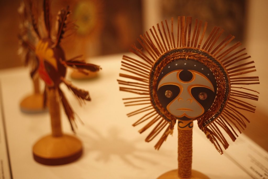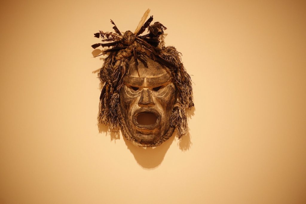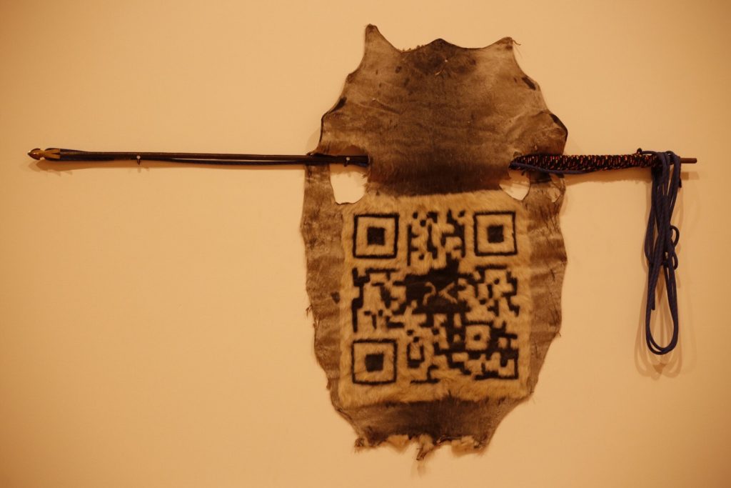 Art allows an open response to the social and personal world that can be bright and colourful. This is seen in the works of American artists of colour Mickalene Thomas’ Qusuquzah, Une Très Belle Négresse #3 and Nick Cave’s Soundsuit. Other works illustrate the tension between the traditional and contemporary, the natural and technological. Now Ottawa-based Inuit artist Ruben Komangapik’s work Nattiqmut Qajusijugut (the seal that keeps us going) features a seal skin prepared and hunted by the artist as well as an embedded QR code that links to a YouTube video of the artist explaining the story of the piece.