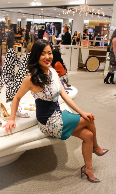 STYLE INSPIRATION: Tonight, Leah’s style is somewhat reminiscent of Breakfast at Tiffany’s, with her black Jill Stewart dress with gold weave and classic sweetheart neckline. She told me she thinks that Nordstrom will elevate fashion in the city.