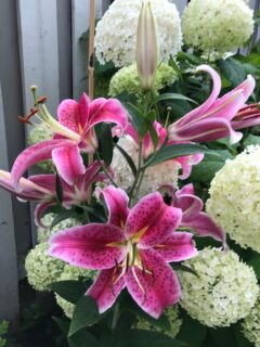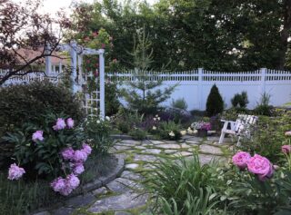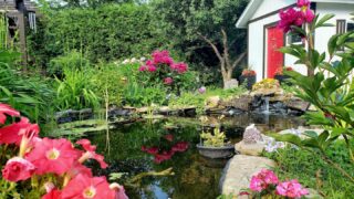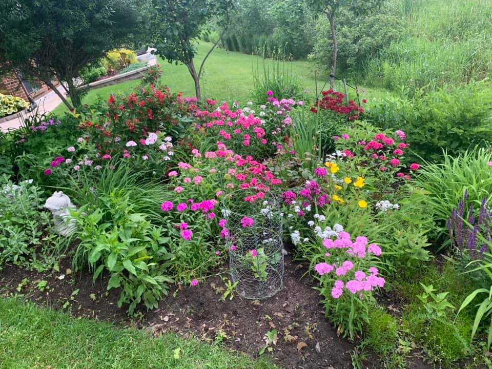 “Butterflies and bees are attracted to the Joe Pye weed (eutrochium) and the canna lilies and roses. The bird bath gives wildlife a chance to cool off and get a drink. The birdhouse attracts a friendly nuthatch family every spring. The salvia, bee balm, and roses, along with the hummingbird feeder, attract many hummingbirds. We use Earth Blend products to control the Japanese beetle population.”