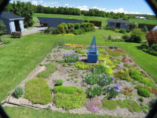 “About 75 varieties of trees, shrubs, and a pond are found on our property. Our property is certified as Backyard Habitat by the Canadian Wildlife Federation. We also are registered as a Monarch Way Station. We have 35 ornamental garden beds, a half-dozen vegetable beds, and a variety of fruiting trees and shrubs on our one-acre property. I am trained as an ecologist and plant physiologist; I do not use pesticides nor known products that negatively impact soil microrganisms and the wide range of insects and other life forms that visit our property. Over the 49 years that we have lived and gardened on our property, we have planted close to 2,000 varieties/cultivars of plants in our beds. (Of course, not all have survived for many reasons!) A unique item is an espaliered combination of four dwarf apples and four grape varieties on the same structure. We also have a small high tunnel for extended seasonal vegetable production.”
