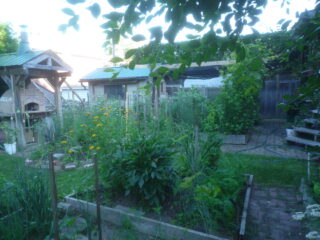 “We have approximately six native species and many pollinator plants (Jacob’s ladder, hostas, bleeding heart, hellebores, etc.), one bird bath, only natural lawn care, no pesticides, and the shed has a green roof!”