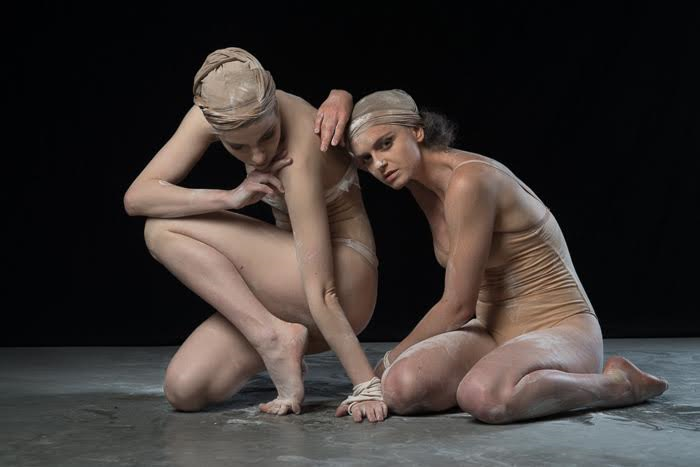 The 13 photographs on display in the exhibition reflect a choreography – a dance – of movement and emotion in the relationship between the two female models. Dressed simply in leotards with their bodies powdered and hair wrapped away, the models were free to interact with each other, with only minimal directions from the photographer. Their poses, set against a dark background are full of grace and raw passion, suggesting a tension somewhere between flirtation and something more carnal.