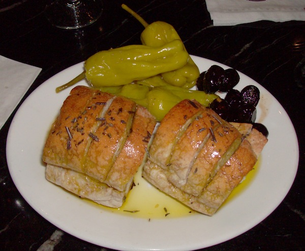 We began our meal with a Veuve Clicquot-Ponsardin Champagne, an amuse bouche of crostini with bruschetta and creamy artichoke spread and a generous portion of black olives and pepperoncinis on the side. A plate of olive oil and roasted rosemary toasted buns also arrived.