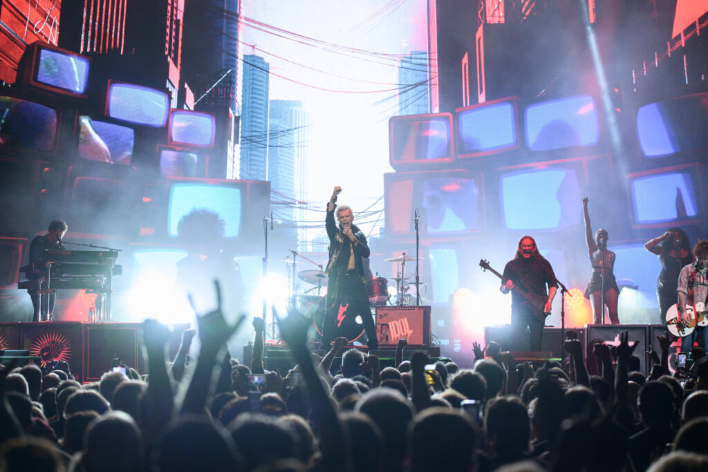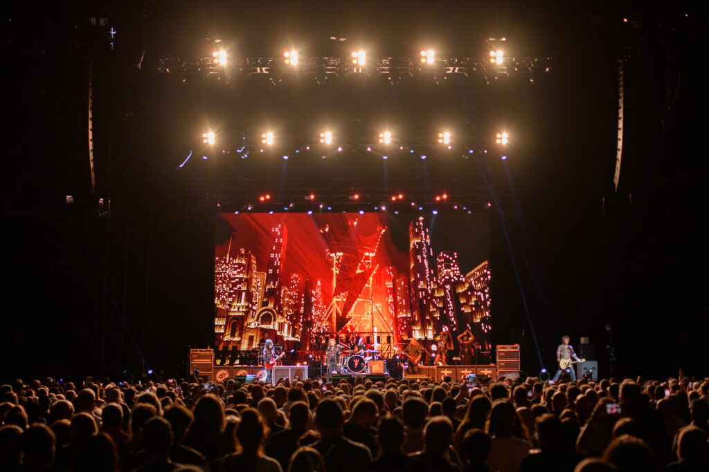 Billy Idol’s set was everything you’d expect an arena rock show to be — massive sound, anthemic singalong hits and eye-catching stage and lighting design, as the band played a against a video screen backdrop, which changed throughout the night to feature a cityscape, TV screens playing back his 80s music video clips of his iconic snarl and spiked hair.