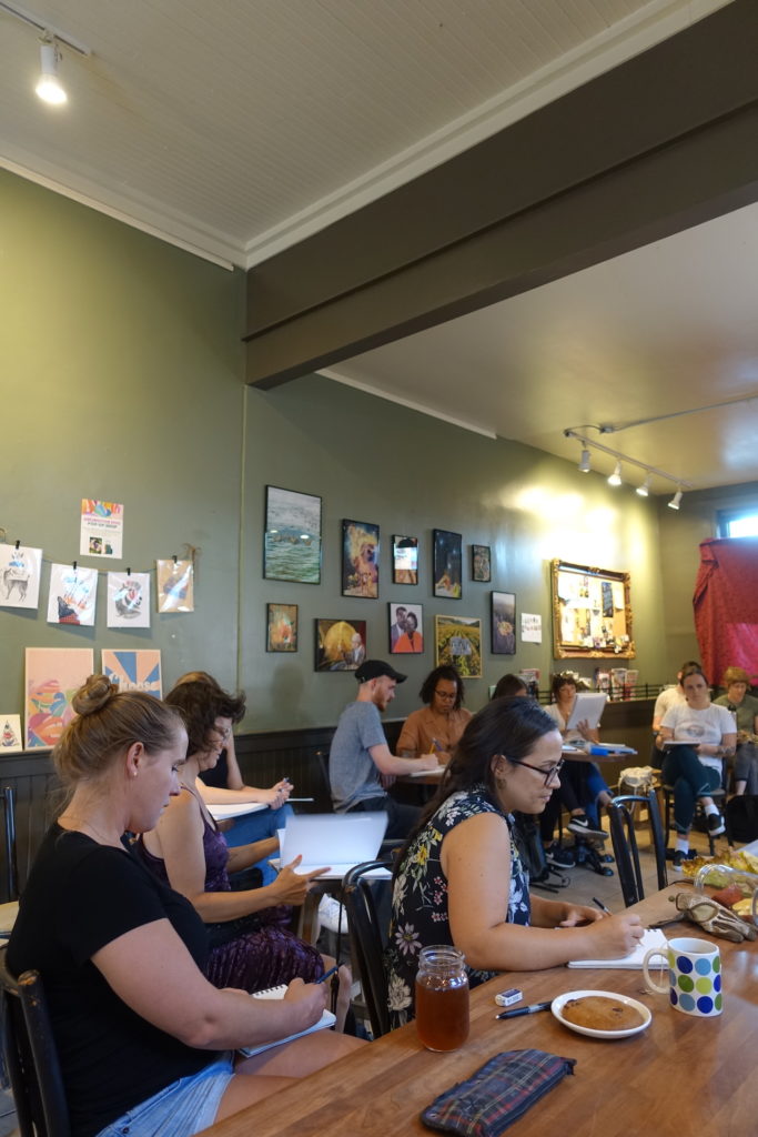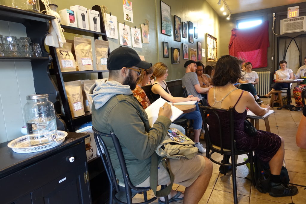 The dual coffee shop and event space is filled with remnants of Ottawa’s creative community. Personal and scenic portraits, pop art prints and cards, and a wood painting crowd the walls. A blend of coffee shop goers and event attendees snatch seats wherever they can, from the concrete front steps to the wooden stools against the basement railing. On the last Monday of every month, between 7-9pm, some stand by the doorways to join Arlington’s Life & Death Art Circle.