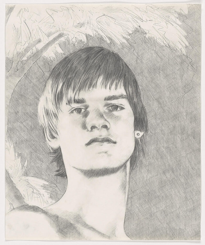 The detailed crosshatching on the 2003 “Untitled” portrait by Toronto artist Paul P. represents a dedication of “deep care” evidenced in delicate graphite strokes. Drawing this way provided new means of looking, a way he could see and understand more. Within the pages of gay erotic magazines, he says he saw heroes similar to himself and queer men he knew; many were depicted before the AIDS crisis of the 1980s.