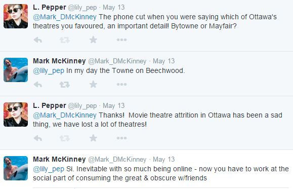 When we moved back, I really enjoyed Lisgar, I went there after going to an all-boys school, and I nearly lost my mind! The Towne cinema was where I’d go to see all the cult classics. [Note: The Towne theatre was on Beechwood, in New Edinburgh. The Bytowne Cinema was named in honour of the Towne cinema plus Ottawa’s nickname of Bytown]