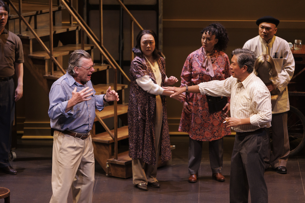 Tom McCamus as Arthur Miller (front-left) and Adrian Pang 彭耀順 as Ying Ruocheng (front-right) with from left: 郝邦宇 Steven Hao as Li Shilong, Phoebe Hu 胡馨勻 as Zhu Lin, Harriet Chung 鍾浩賢 as Hui Li and Derek Kwan 關顯揚 as Mo in Salesman in China. Stratford Festival 2024. Photo: David Hou.