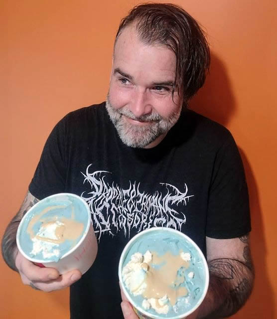 Alleway embodies the very essence of a dairy disruptor. His slicked-back undercut hairstyle and black band shirt reveal an armful of tattoos, fittingly including an ice cream cone on his scooping hand.